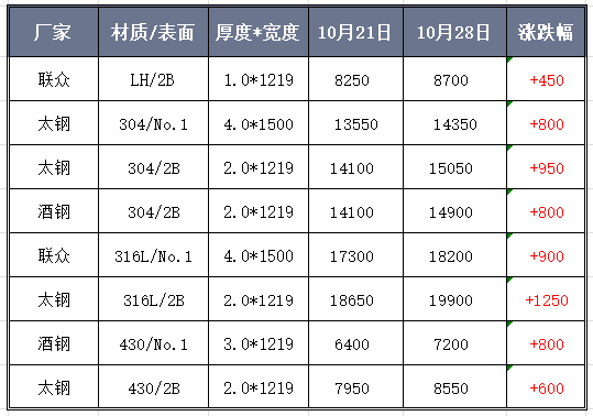 304市场同样陷入“汹涨”模式,单日涨幅高达300~500元/吨,甚至出现了单日多次调涨的现象。短短几天的时间,基价已有超出了15000元/吨。316L冷热轧产品的涨势也十分火爆,周间涨幅也有达1000元以上。430价格也同时逃不出涨价气氛,太钢市场价格已经直指8550!